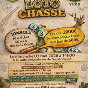 Les Associations Communales de Chasse Agrée, l’ACCA de Saint-Vivien et l’ACCA d’Yves organisent un loto dimanche 3 mai 2026 à 14h00 à la salle polyvalente de Saint-Vivien, animé par Bil’Animation. Avec la tombola, de nombreux lots sont à gagner! Ouverture des portes à partir de12h00. Les réservations sont au 06 75 87 28 40. Venez tenter votre […]